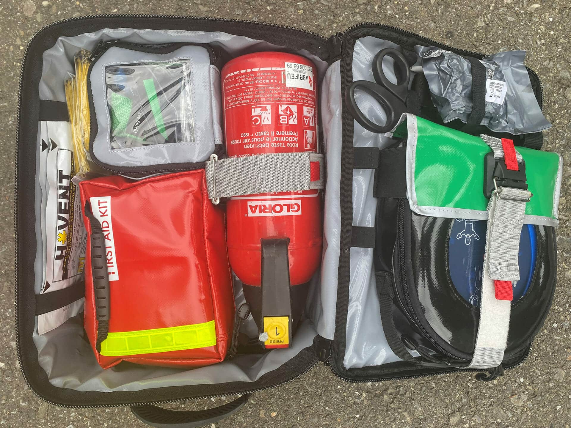 Les voitures de police regorgent de moyens afin de mener à bien nos missions. Un nouveau sac a désormais pris place à bord. Il contient un défibrillateur, un extincteur d’urgence ainsi que le matériel de secours nécessaire au traitement allant d’une simple blessure à une hémorragie massive. Une trousse contenant l’équipement de protection individuelle y est également intégrée.