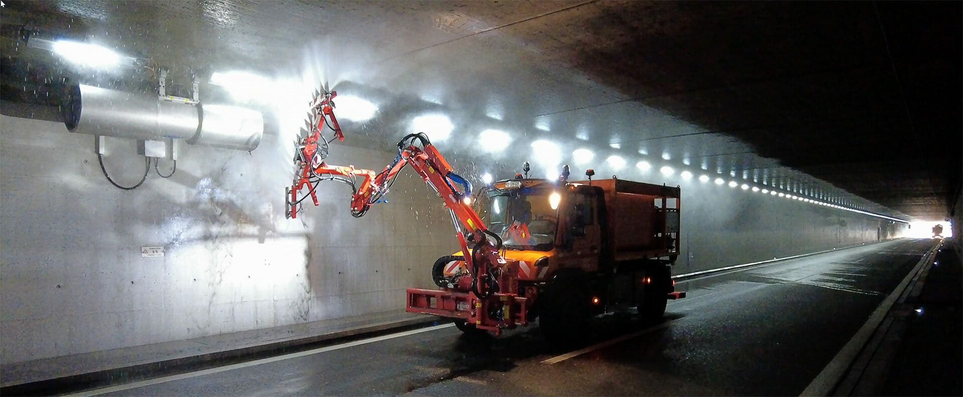 Un autre travail de titan de ces hommes orange débute en en avril et dure jusqu’à mi-juin. En effet, une fois par année tous les tunnels des axes principaux du canton sont lavés, nettoyés et leurs installations (éclairage, bornes SOS, ventilations, etc…) sont contrôlées.